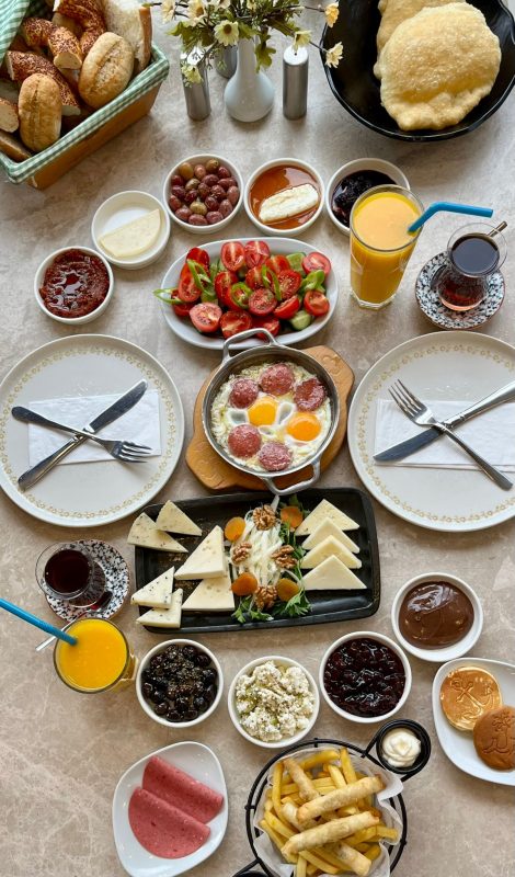 Çemen, ciza, bal kaymak, reçel, siyah ve yeşil zeytin, tereyağı, lorlu karadut, kahvaltı salatası, ceviz, kayısı, çikolata kreması, salam, pankek, pişi, portakal suyu, kalem böreği, patates kızartması.