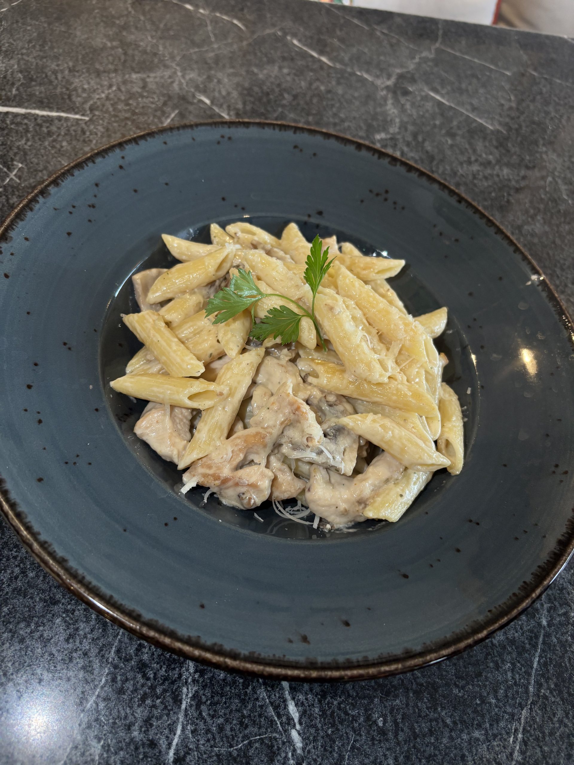 Penne makarna, tavuk, krema ve mantarın buluşması