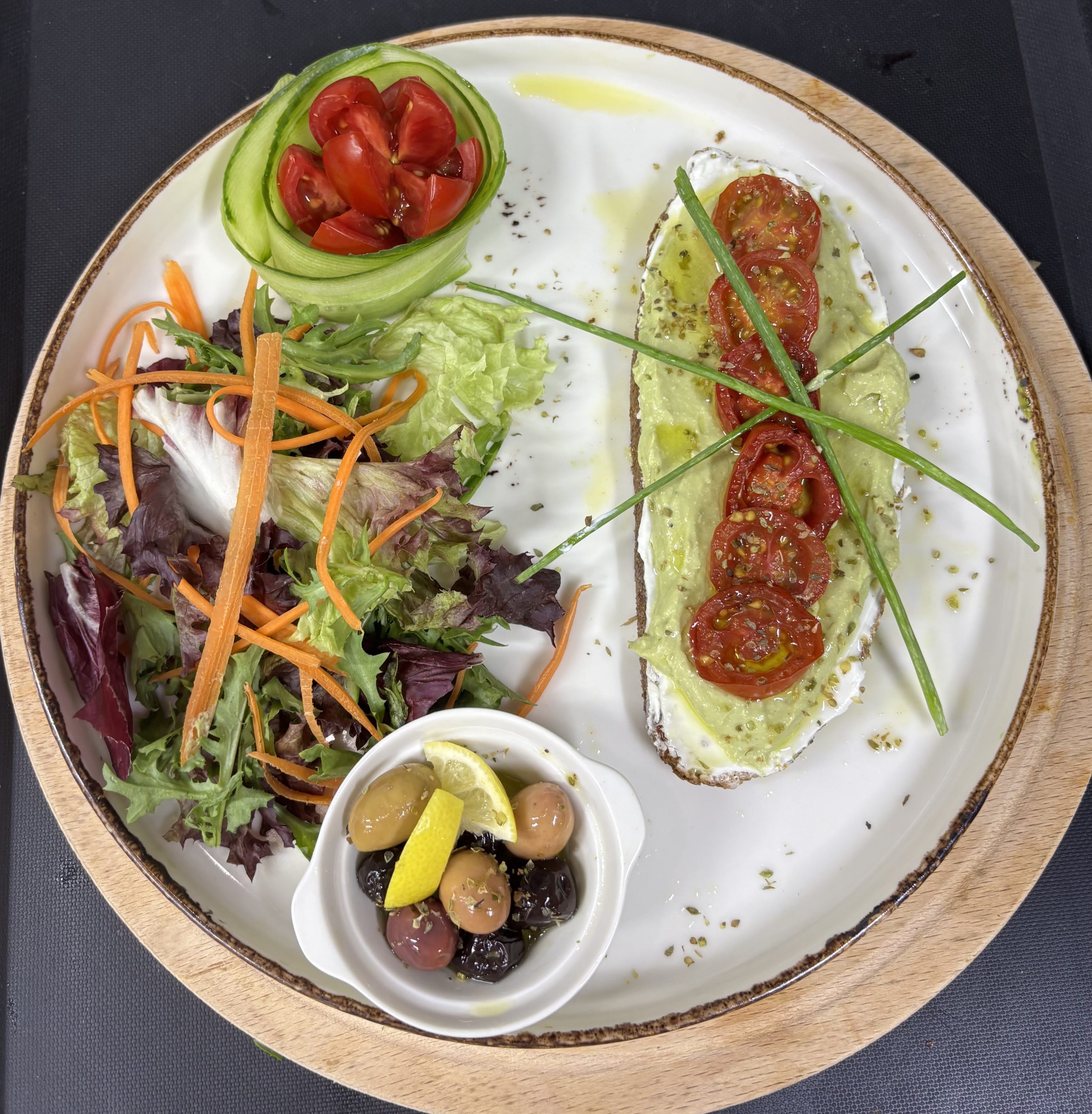 Beyaz peynir üzerine avokado püresi, közlenmiş domates, frenk soğanı, karışık zeytin ve karışık yeşilliklerle servis edilir.